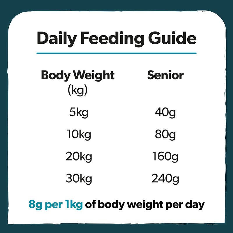 Initially feed your dog 8g of dry food per 1kg of bodyweight per day. Adjust this amount according to your dog's individual age, breed and activity levels to help your dog maintain an ideal bodyweight.