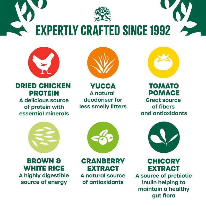 Dried chicken protein* (20%), brown rice* (18.6%), white rice* (18.5%), poultry fat*, maize gluten, pea protein, potato protein, chicken gravy, tomato pomace* (2.5%), dried carrots* (1.1%), dried meat-free stock, minerals, chicory pulp*, fish oil, chicory extract* (0.25%), cranberry extract* (0.05%), glucosamine (0.045%), nettles*, yucca extract* (0.02%), chondroitin (0.005%). *Natural ingredient.