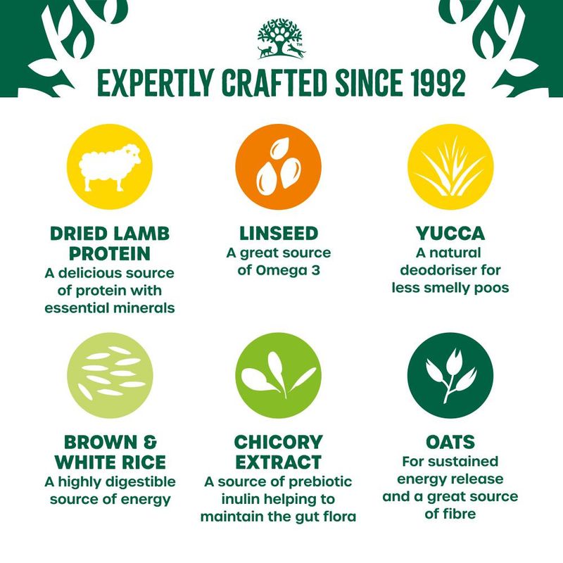 Dried lamb protein* (19%), barley*, naked oats*, brown rice* (13%), white rice* (13%), poultry fat*, whole linseed* (3.9%), pea protein, lamb gravy, sugar beet pulp*, alfalfa meal*, minerals, seaweed* (0.5%), fish oil, chicory extract* (0.1%), yucca extract* (0.02%). *Natural ingredient.