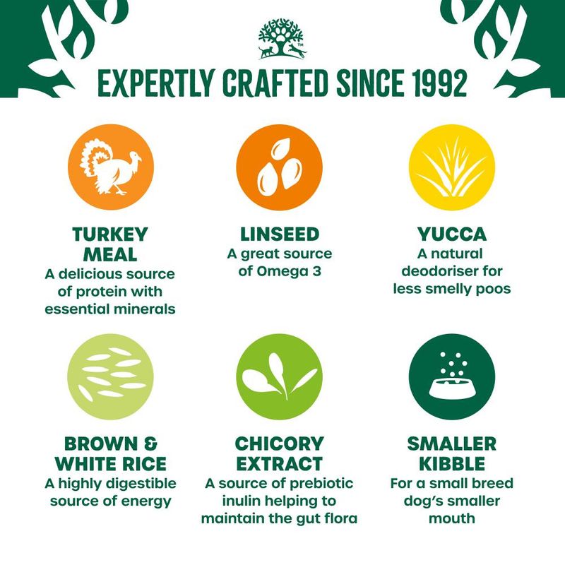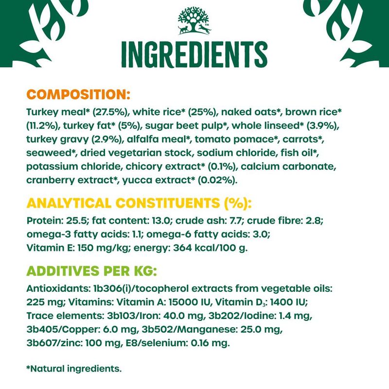 Dried turkey protein* (26.5%), naked oats*, brown rice* (13%), white rice* (13%), barley*, poultry fat*, sugar beet pulp*, whole linseed* (3.9%), turkey gravy, alfalfa meal*, tomato pomace*, minerals, seaweed* (0.5%), dried carrots*, dried vegetarian stock, fish oil, chicory extract* (0.1%), yucca extract* (0.02%).