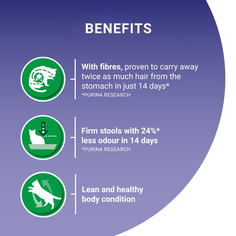 - Reduces hairball formation: In 14 days, this special fiber mix helps transport twice as much swallowed hair through the digestive system.