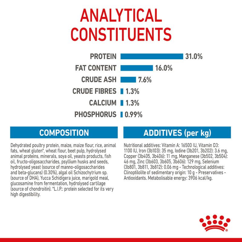 Dried poultry protein, maize, maize feed meal, rice, animal fat, wheat gluten feed*, wheat feed meal, dried beet pulp, hydrolysed animal protein, minerals, soya oil, yeast by-products, fish oil, fructo-oligosaccharides, psyllium [husks and seeds], hydrolysed yeast [source of mannan-oligosaccharides and beta-glucan] (0.3%), algae oil Schizochytrium sp. [source of DHA], juice from Yucca schidigera, marigold meal, glucosamine from fermentation, hydrolysed cartilage [source of chondroitin].