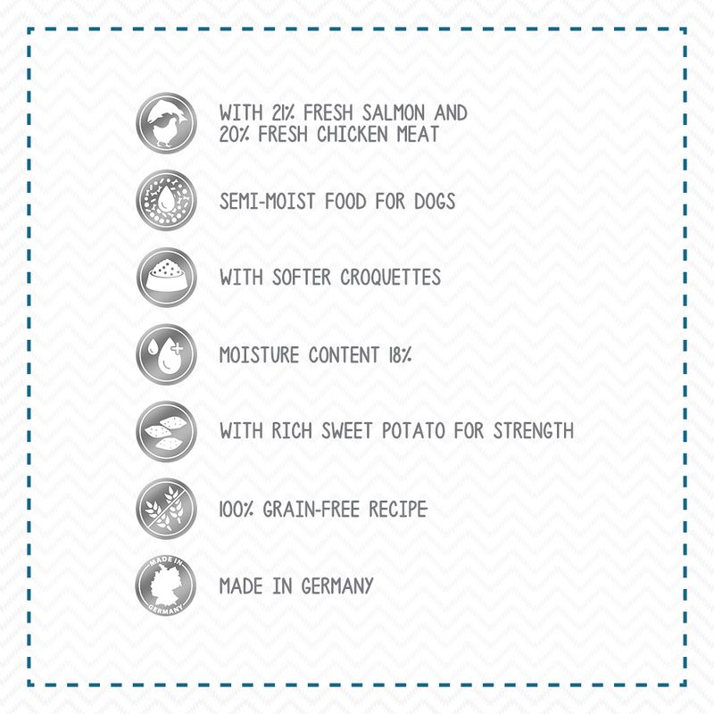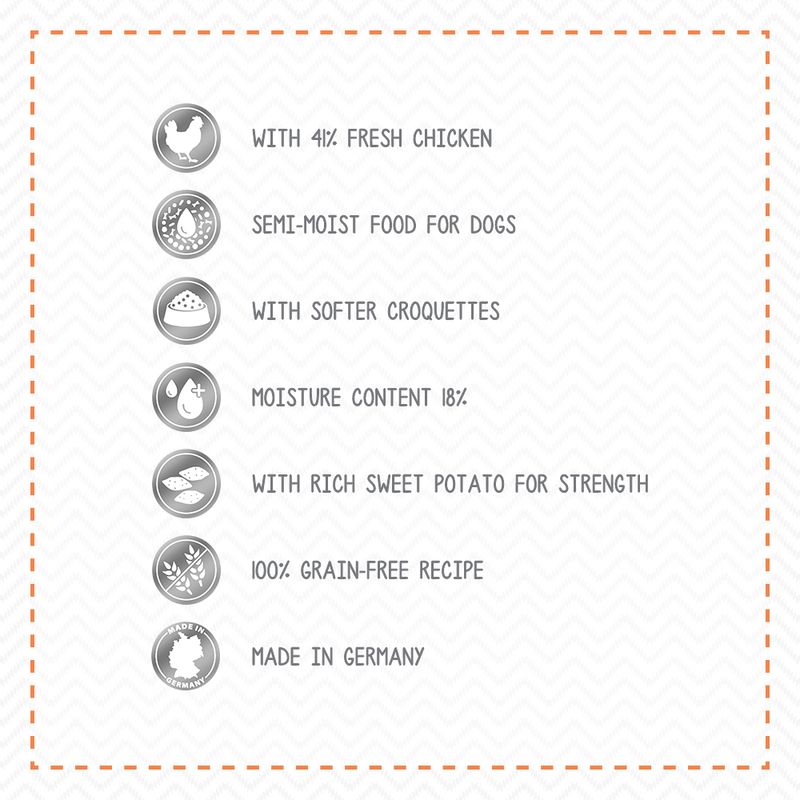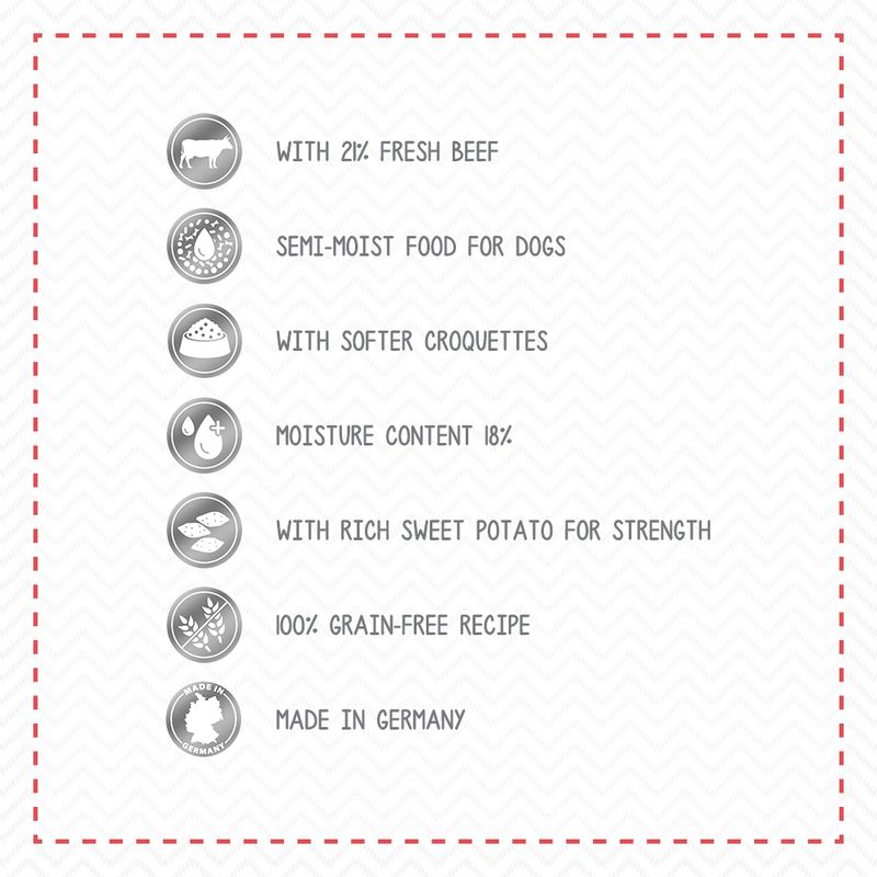 - Semi-moist food for adult dogs: softer kibble with 18% moisture content