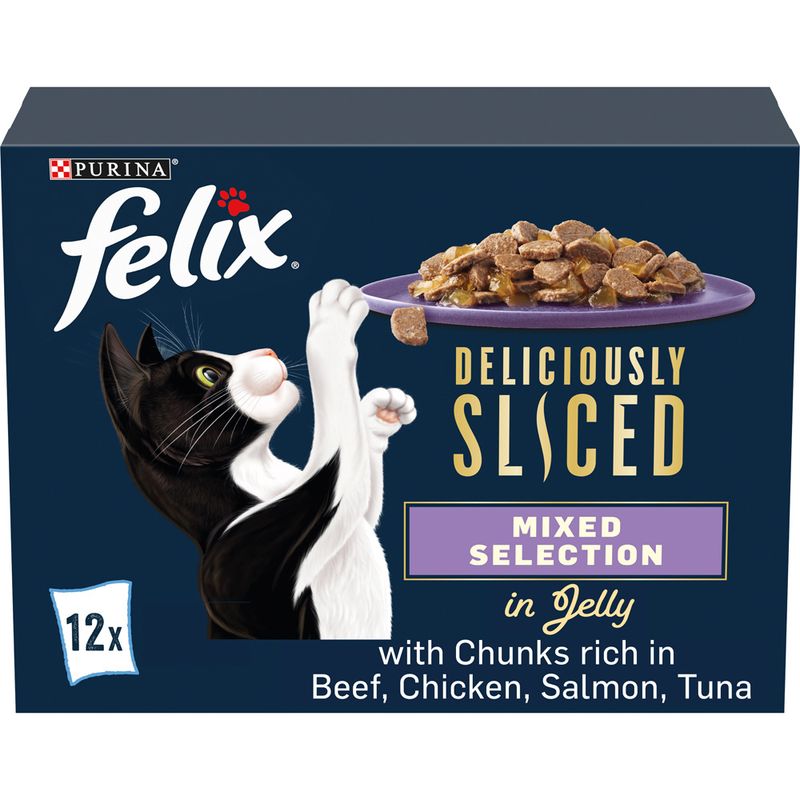Felix Deliciously Sliced are perfectly steam‑cooked slices which are high in protein and covered in a tasty jelly your cat will love!