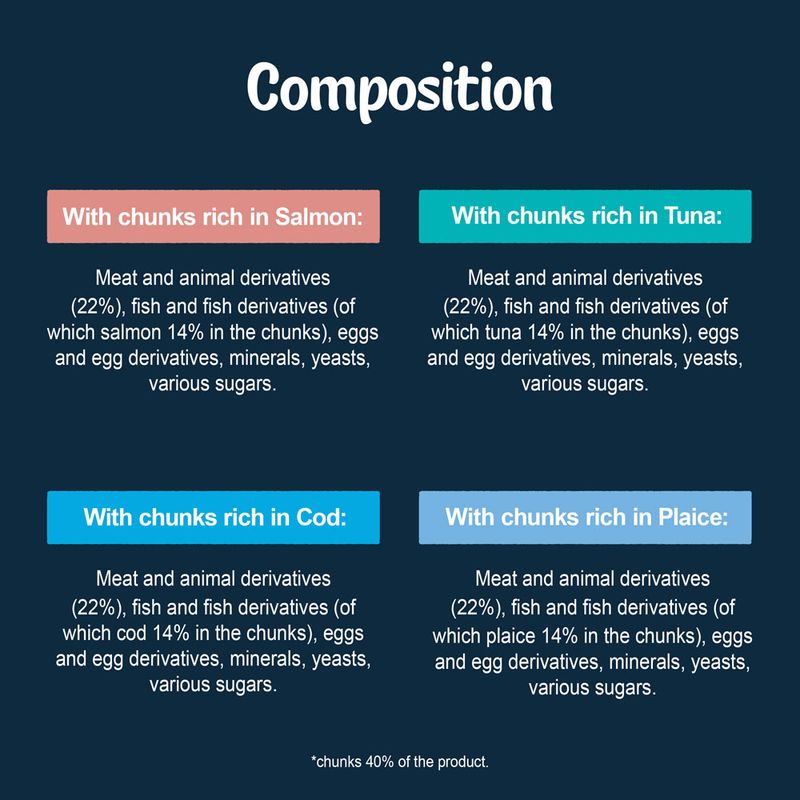 Tuna: Meat and animal by-products (22%), fish and fish by-products (including 14% salmon in the chunks), eggs and egg by-products, minerals, yeasts, various sugars.