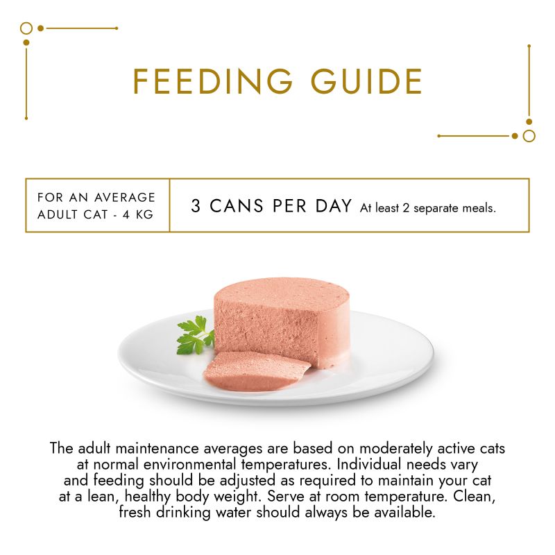 For an average adult cat (4kg), feed 4 cans per day in at least 2 - 3 separate meals. The adult maintenance averages are based on moderately active cats at normal environmental temperatures. Individual needs vary and feeding should be adjusted as required to maintain your cat at a lean, healthy body weight. Serve at room temperature and fresh clean drinking water should be always available.