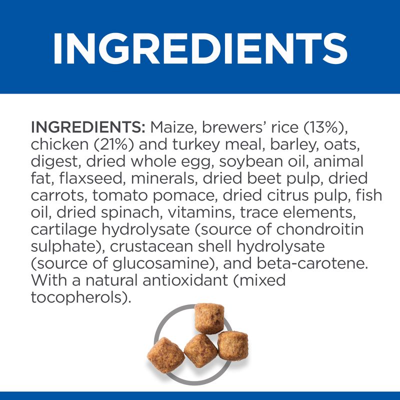 Maize, brewers’ rice (13%), chicken (21%) and turkey meal, barley, oats, digest, dried whole egg, soybean oil, animal fat, flaxseed, minerals, dried beet pulp, dried carrots, tomato pomace, dried citrus pulp, fish oil, dried spinach, vitamins, trace elements, cartilage hydrolysate (source of chondroitin sulphate), crustacean shell hydrolysate (source of glucosamine), beta-carotene (1,5 mg/kg).