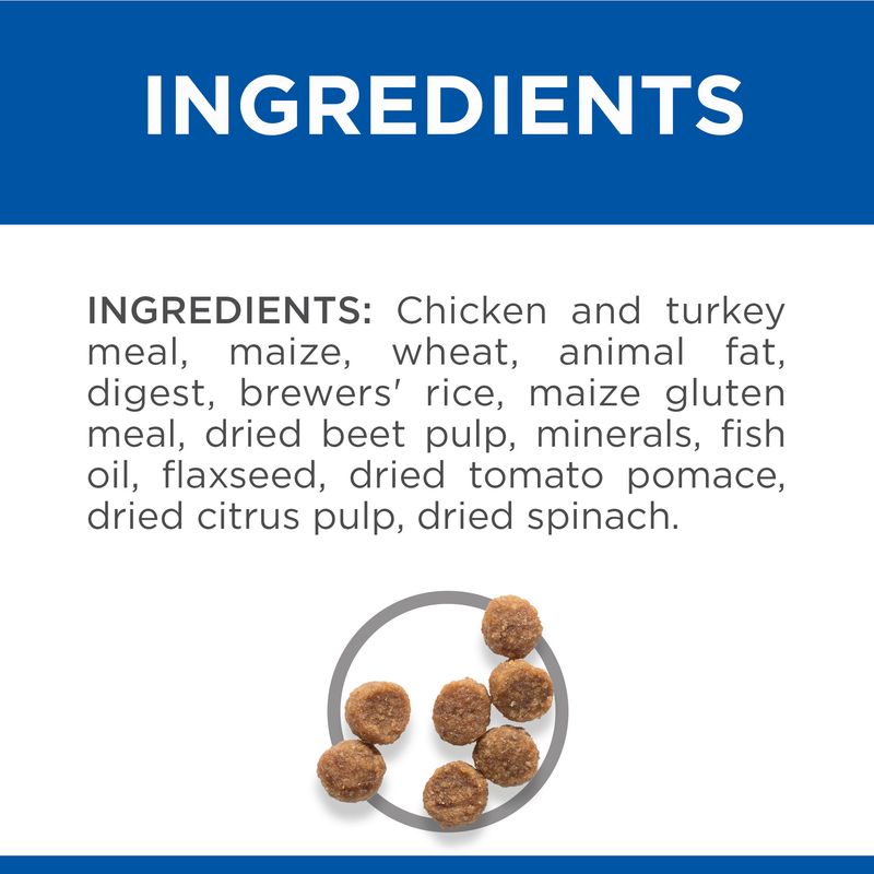 Chicken and turkey meal, maize, wheat, animal fat, digest, brewers' rice, maize gluten meal, dried beet pulp, minerals, fish oil, flaxseed, dried tomato pomace, dried citrus pulp, dried spinach.