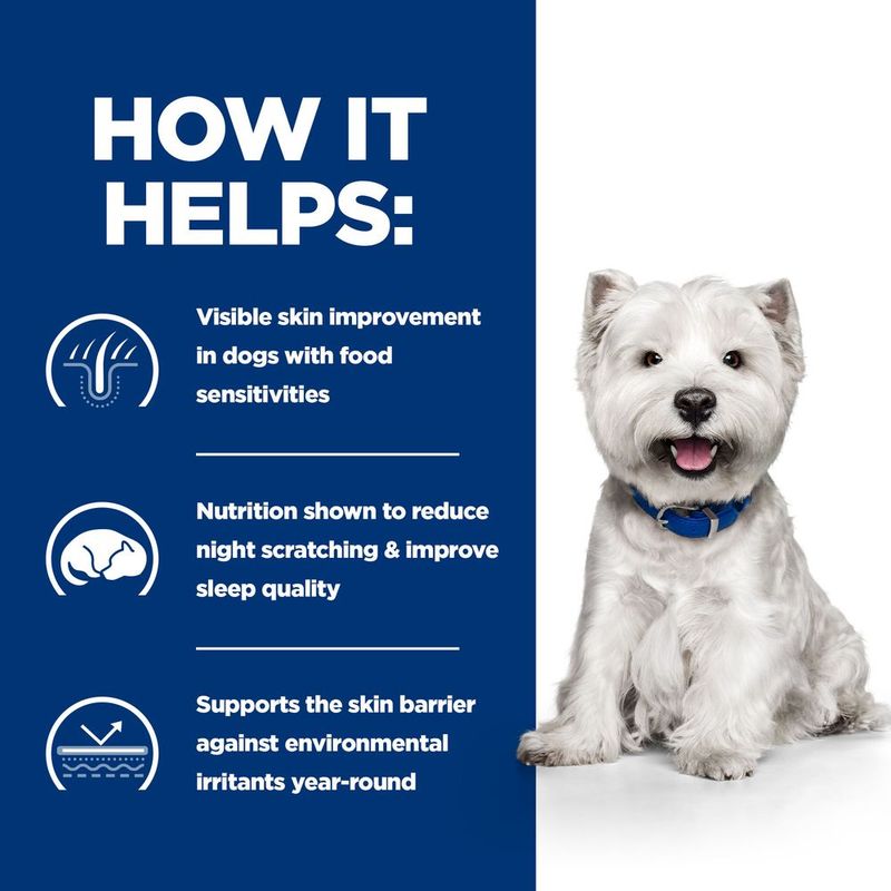 Hill’s Prescription Diet Canine Mini Derm Complete Dry Dog Food is a complete dietetic dog food.