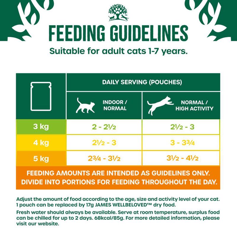 Adjust the feeding amount according to your pet's age, size and activity level. 1 pouch can be replaced by 17g James Wellbeloved dry food.