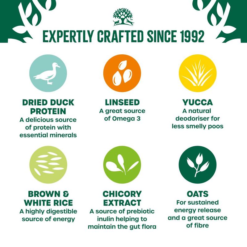 Dried duck protein* (24%), naked oats*, brown rice* (13%), white rice* (13%), barley*, whole linseed* (4%), pea starch, poultry fat*, duck gravy, alfalfa meal*, pea fibre*, chicory pulp*, minerals, seaweed* (0.5%), fish oil, chicory extract* (0.1%), yucca extract* (0.02%). *Natural ingredient. Produced in a factory that handles grains and other protein sources.