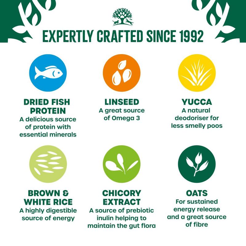 Dried fish protein* (20%), barley*, naked oats*, brown rice* (13%), white rice* (13%), whole linseed* (3.9%), fish stock, poultry fat*, dried peas*, fish oil, alfalfa meal*, minerals, chicory pulp*, seaweed* (0.5%), chicory extract* (0.1%), yucca extract* (0.02%). *Natural ingredient.