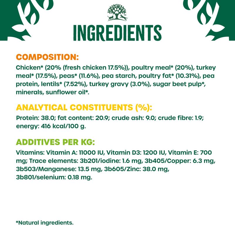 Chicken* (20%, including 17.5% fresh chicken), poultry meal* (20%), turkey meal* (17.5%), peas* (11.6%), pea starch, poultry fat* (10.31%), pea protein, lentils* (7.52%), turkey gravy (3%), sugar beet pulp*, minerals, sunflower oil*.