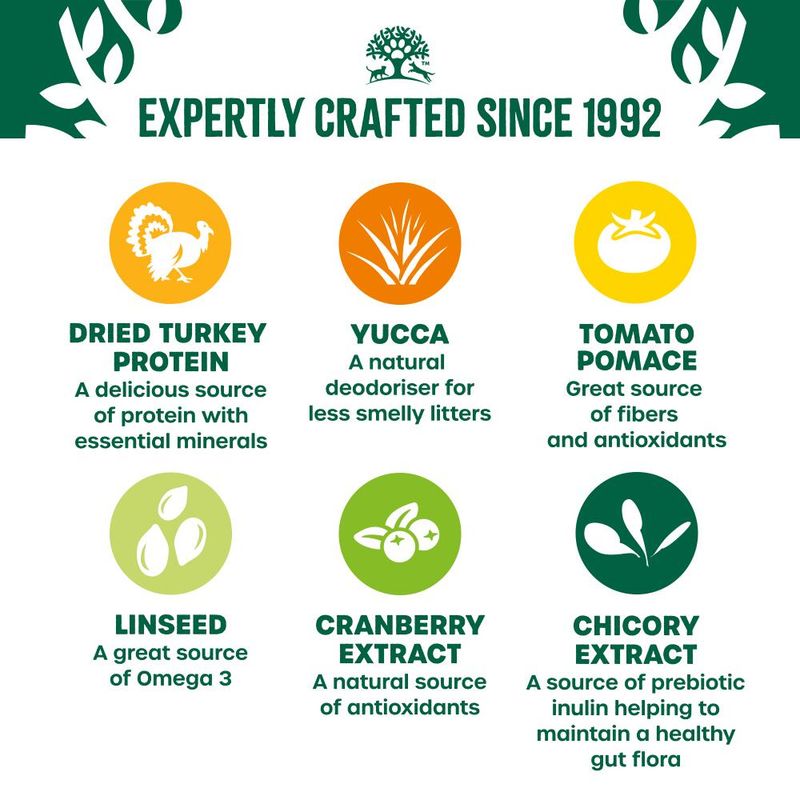 Dried turkey protein* (30%), pea starch, poultry fat*, pea protein, dried potatoes*, potato protein, turkey gravy, tomato pomace* (3.5%), whole linseed* (1.5%), dried meat-free stock, minerals, fish oil, chicory extract* (0.25%), dried carrots* (0.1%), cranberry extract* (0.05%), yucca extract* (0.02%). *Natural ingredient. Produced in a factory that handles grains and other protein sources.