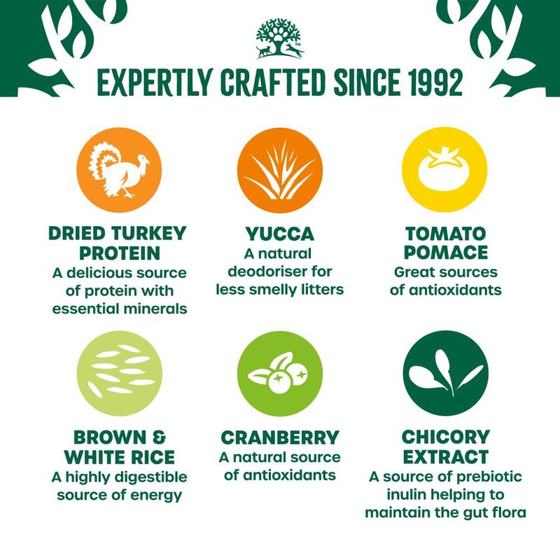 Dried turkey protein* (26%), white rice* (21%), poultry fat*, brown rice* (8.9%), pea protein, potato protein, maize gluten, turkey gravy, tomato pomace* (2.4%), dried meat-free stock, pea starch, minerals, fish oil, chicory extract* (0.25%), dried carrots* (0.1%), cranberry extract* (0.05%), yucca extract* (0.02%). *Natural ingredient.