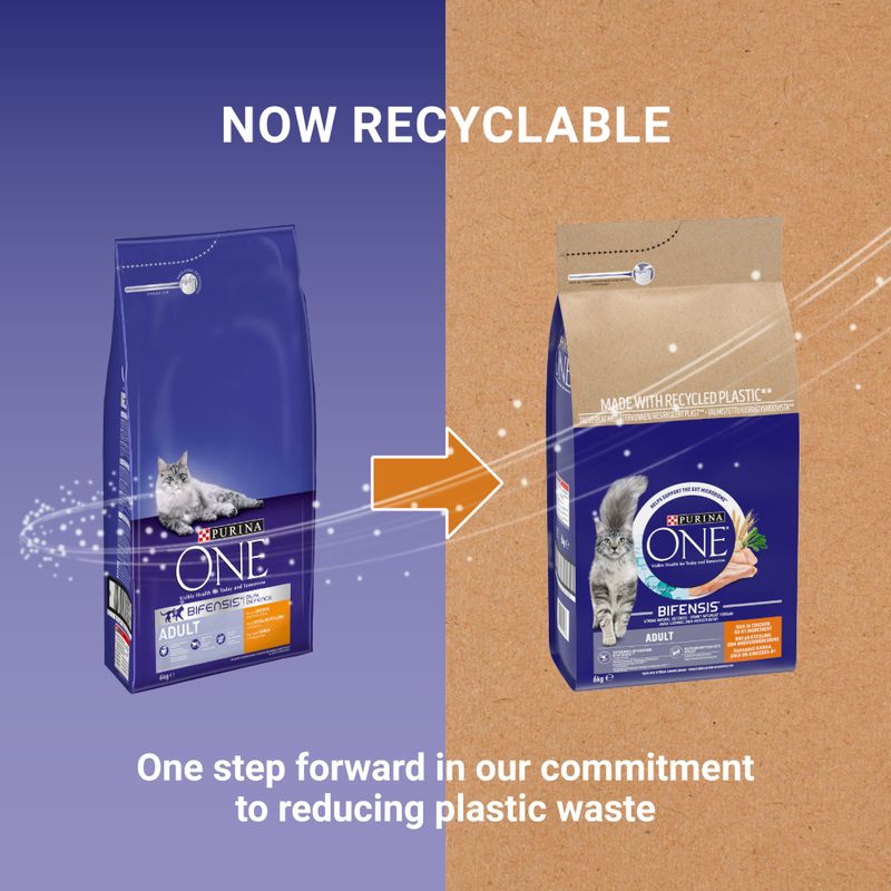 PURINA ONE Adult Chicken & Whole Grains is a complete dry cat food.