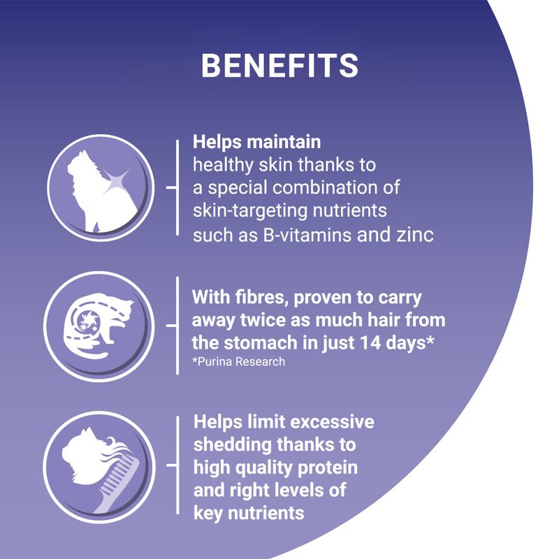 The tasty kibble is made with a special combination of fibres which help to transport swallowed hair through the digestive system, reducing hairball formation. PURINA ONE Coat & Hairball also contains premium protein, vitamins and key nutrients that support healthy skin and fur while helping to reduce excessive shedding.