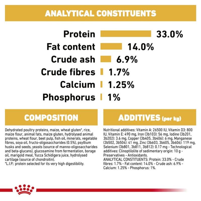 Dried poultry protein, maize, wheat gluten*, rice, maize flour, animal fat, maize gluten, hydrolysed animal proteins, wheat flour, beet pulp, fish oil, minerals, vegetable fibres, soya oil, fructo-oligosaccharides (0.5%), psyllium (husks and seeds), yeast (source of mannan-oligosaccharides and beta-glucans), glucosamine from fermentation, borage oil, marigold flour, juice of Yucca Schidigera, hydrolyzed cartilage (source of chondroitin).