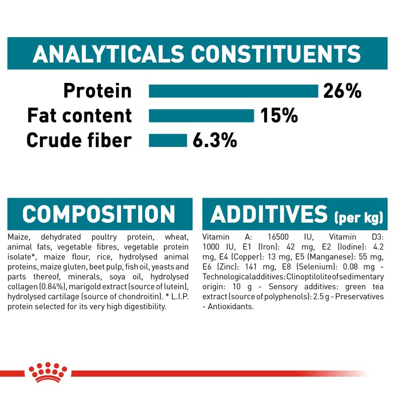 Corn, poultry protein (dried), wheat, animal fat, lignocellulose, vegetable protein isolate, cornmeal, rice, animal protein (hydrolysed), corn gluten meal, dried sugar beet pulp, fish oil, yeast and its derivatives, minerals, soya oil, hydrolysed collagen (0.84%), marigold flower meal [source of lutein], cartilage hydrolysate [source of chondroitin].