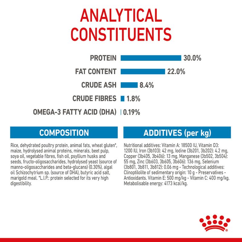 Rice, dried poultry protein, animal fat, wheat gluten meal*, maize, hydrolysed animal protein, minerals, dried beet pulp, soya oil, lignocellulose, fish oil, psyllium [husks and seeds], fructo-oligosaccharides, hydrolysed yeast [source of mannan-oligosaccharides and beta-glucan] (0.3%), algae oil Schizochytrium sp. [source of DHA], butyrate, marigold meal.