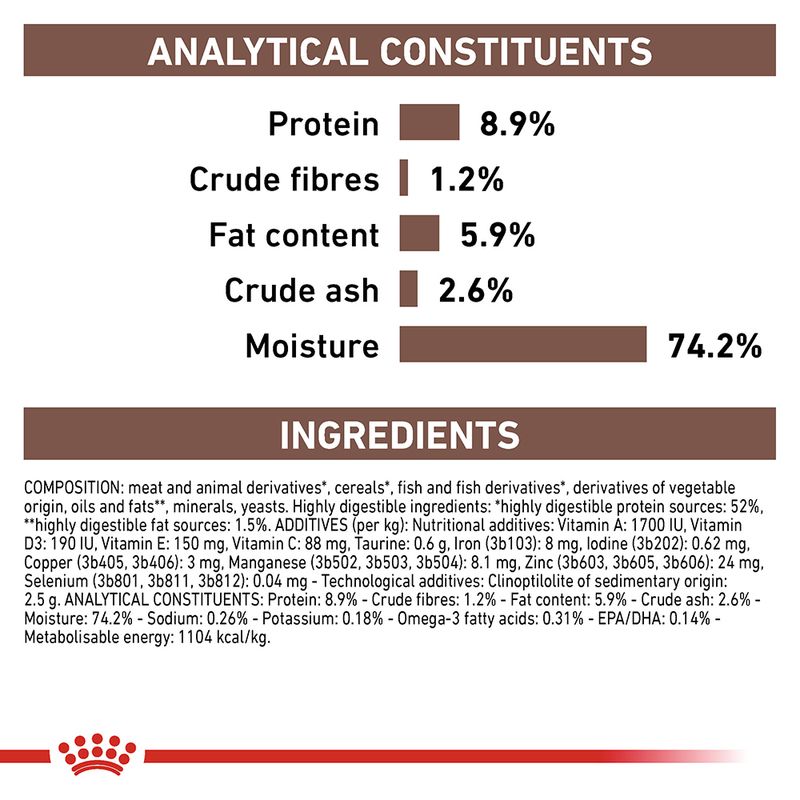 Royal Canin Veterinary Canine Gastrointestinal Loaf has a recipe made with easily‑digestible ingredients, which is well‑accepted by many dogs. The balanced mix of fibres, including prebiotics, encourages digestion and acceptance.