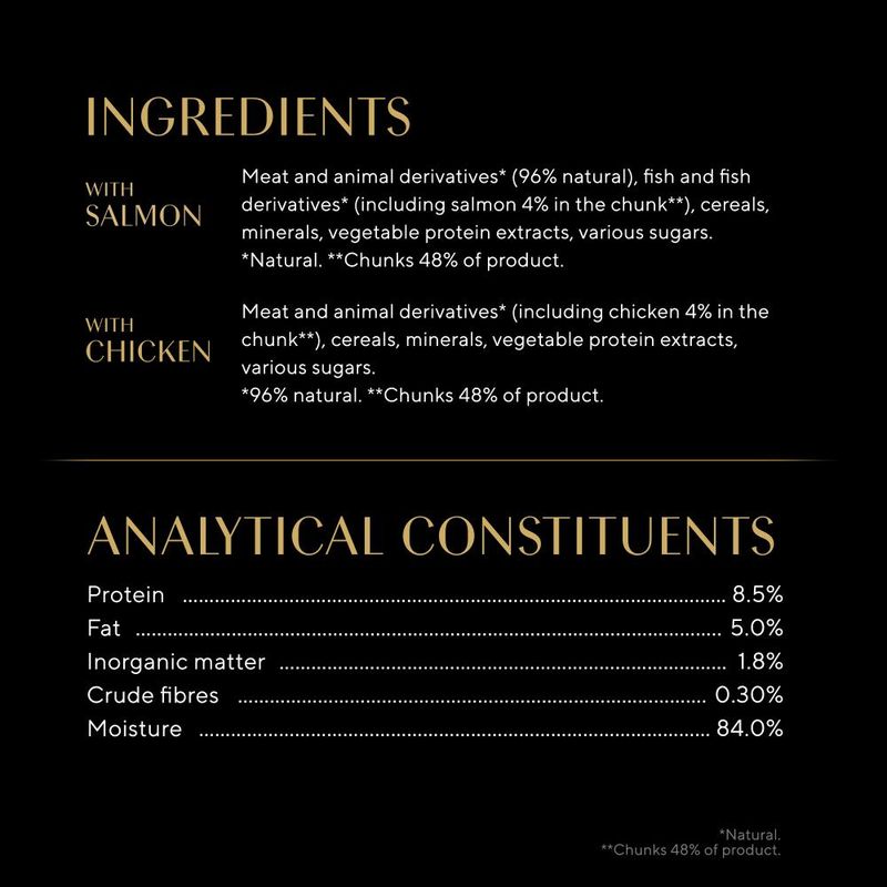 Meat and animal by-products* (96% natural), fish and fish by-products* (including 4% salmon in chunks**), cereals, minerals, vegetable protein extracts, various sugars.
