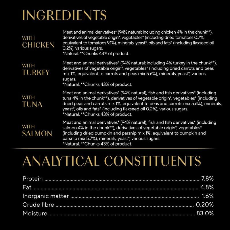 Meat and animal by-products* (94% natural), vegetables* (including 4% carrots and peas mix), fish and fish by-products* (including 4% salmon in chunks**), vegetable by-products*, minerals, yeast*, various sugars.