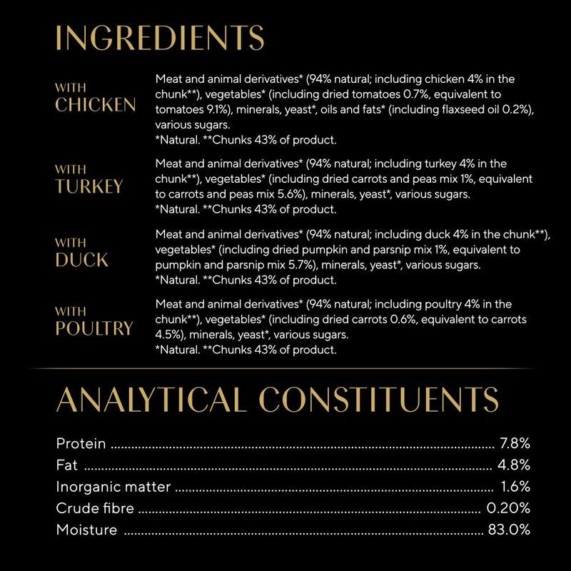 Meat and animal by-products (40%, 94% natural*, including 4% duck in chunks**), vegetables* (including 1% dried pumpkin and parsnip mix, equivalent to 5.7% pumpkin and parsnip mix), minerals, yeast*, various sugars.
