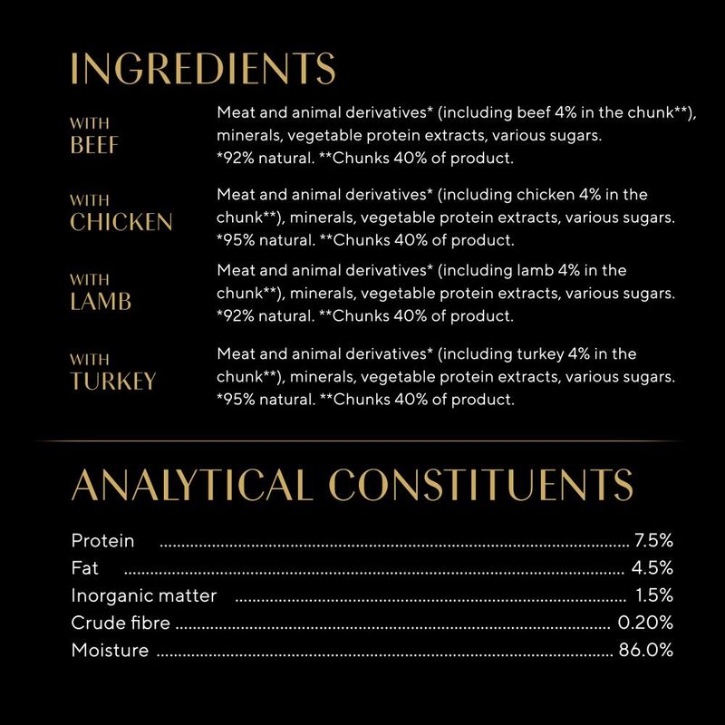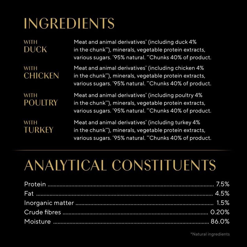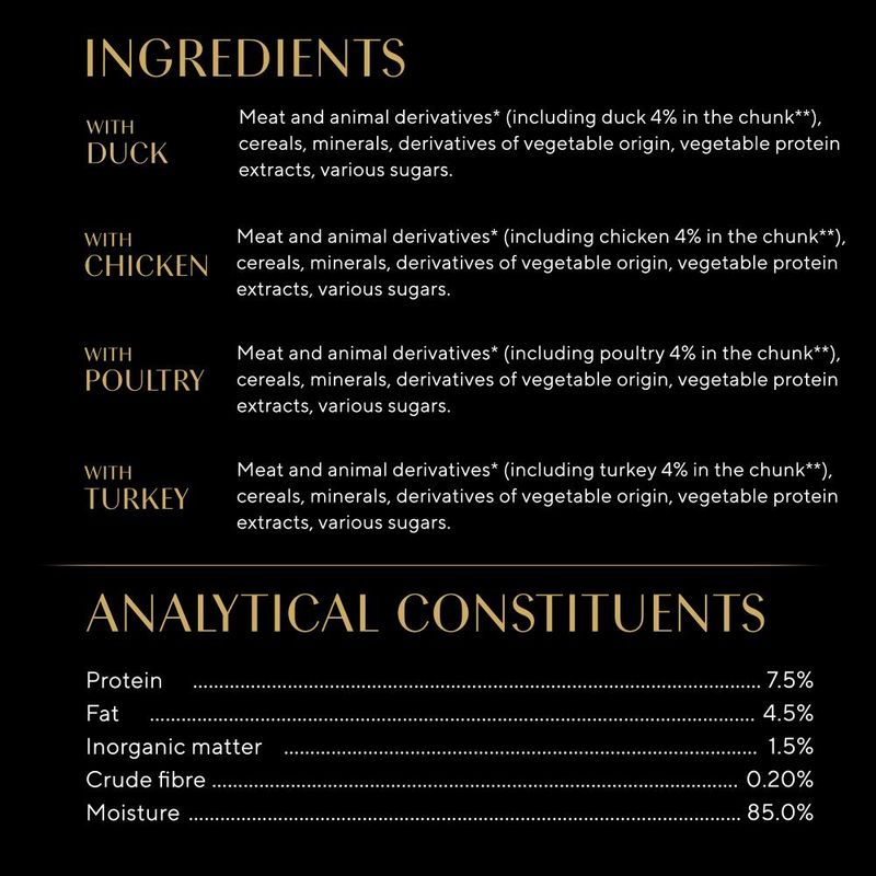 Meat and animal by-products* (incl. 4% poultry in chunks**), minerals, vegetable protein extracts, various sugars.