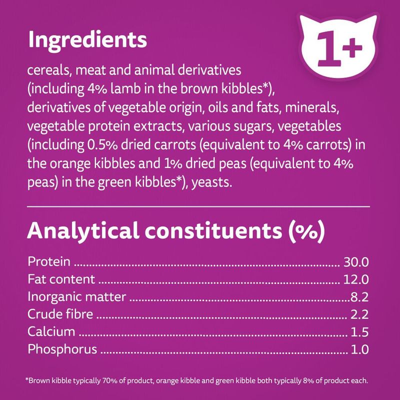 Grain, meat and animal by-products (including 4% lamb in the brown kibbles*), vegetable by-products, oils and fats, minerals, vegetable protein extracts, various sugars, vegetables (including 0.5% dried carrots, equivalent to 4% carrots, in the orange kibbles and 1% dried peas, equivalent to 4% peas, in the green kibbles*), yeasts.