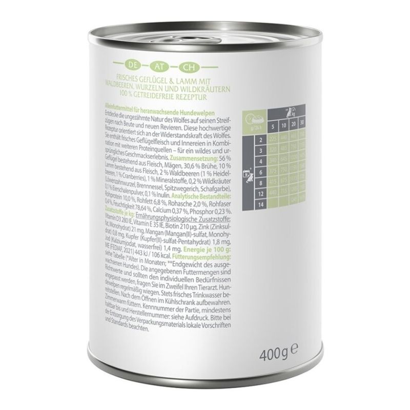 - Complete wet dog food, based on the nutritional habits of the wolf in the wild: suitable for young dogs of all breeds and sizes