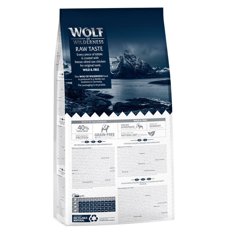 In Scandinavia, wolves would feed on salmon from creeks and rivers, reindeer from polar regions, and free‑ranging chickens—just as this food does for your dog. Wolf of Wilderness is truly species‑appropriate: it’s a grain‑free recipe packed with fresh meat, wild berries, roots, and herbs.